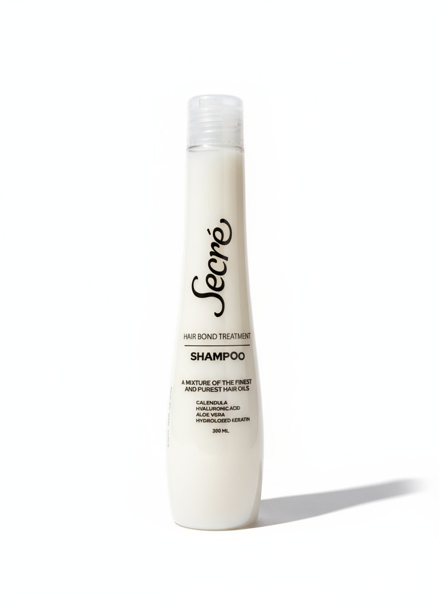 شامبو Secré Hair Bond Treatment ينظّف بلطف ويحافظ على رطوبة الشعر. بخلاصة Calendula، Hyaluronic Acid، Aloe Vera، كيراتين متحلّل ومزيج زيوت نقية لنعومة ولمعان أسهل في التصفيف—مناسب للاستخدام اليومي (300 مل).